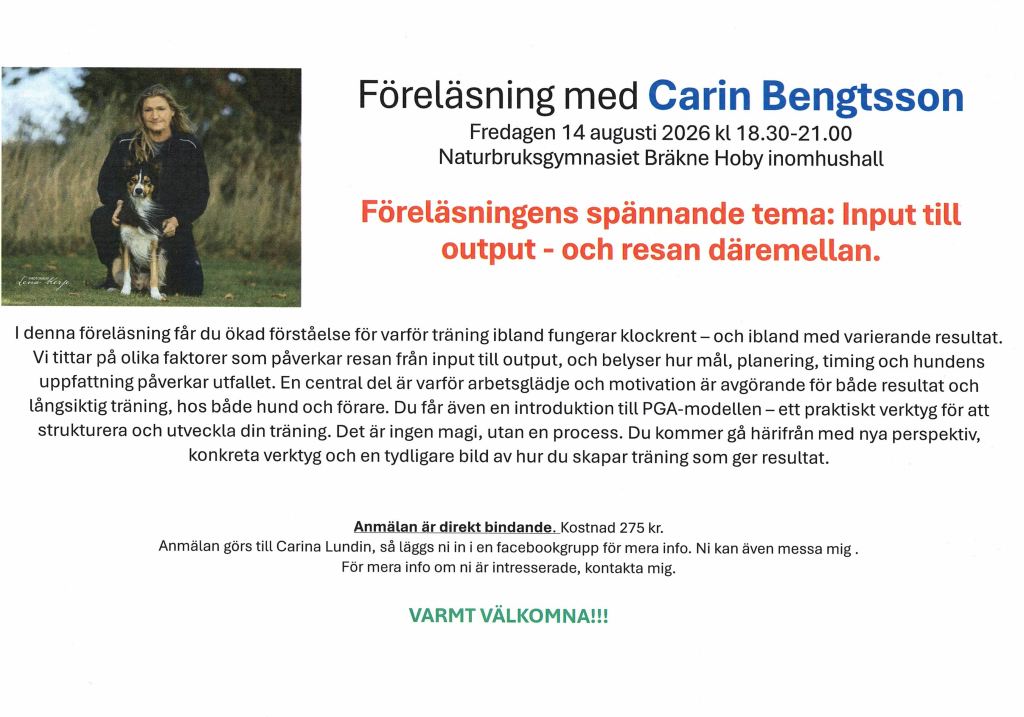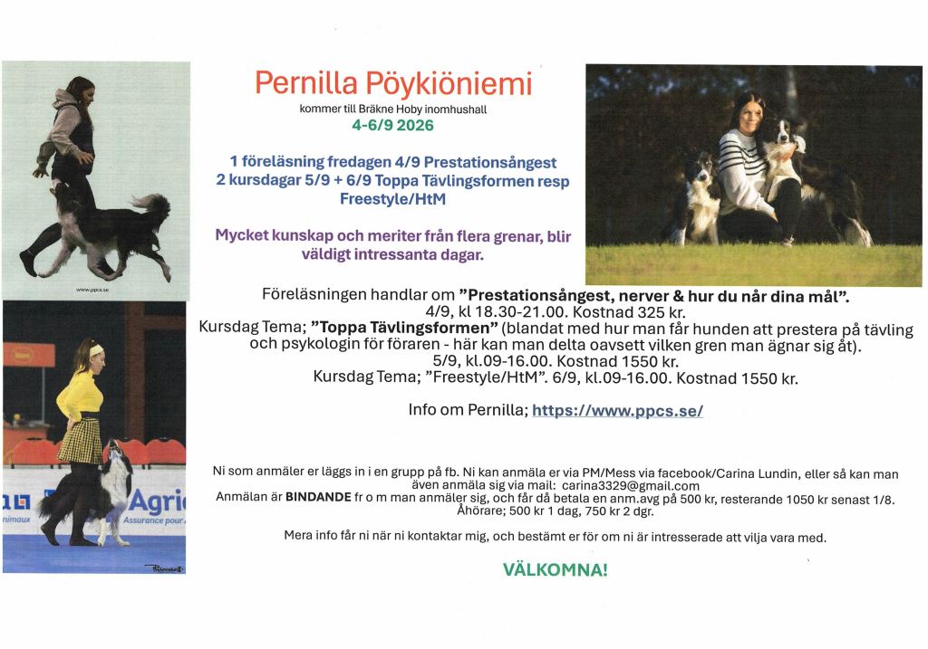 Jag kommer att ha Pernilla Pöykiöniemi i Bräkne Hoby inomhushall + teorisal,