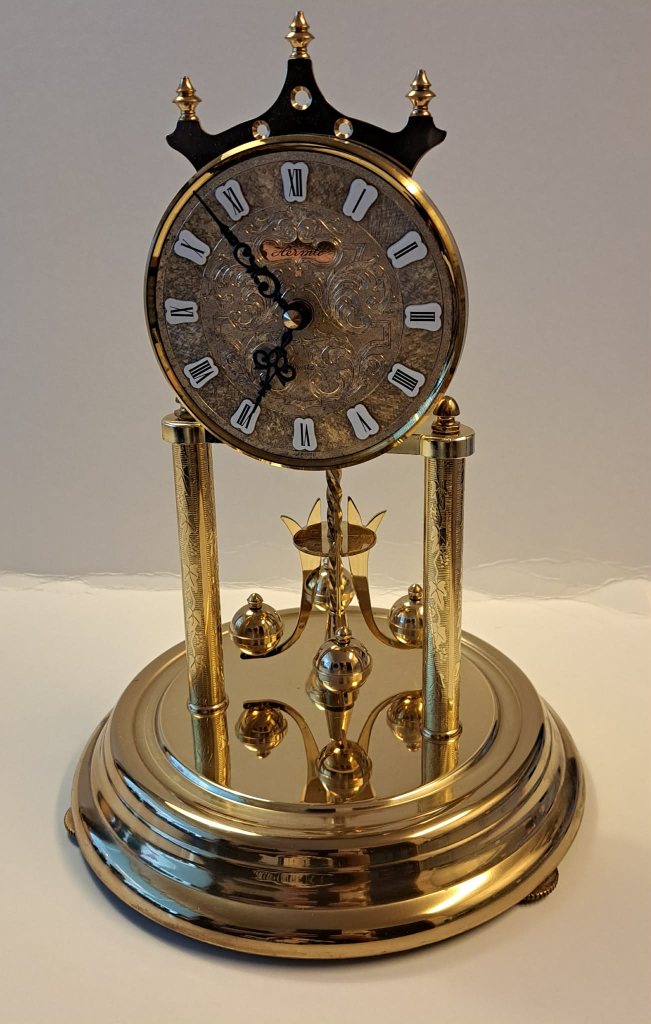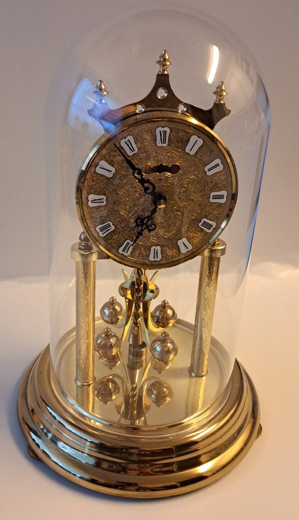 Ett pendelur med en detaljerad urtavla med romerska siffror. Uret har en plastkupa.